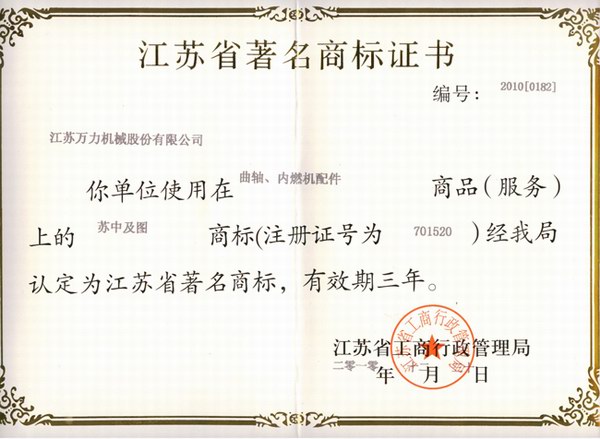 Jiangsu famous trademark certificate |