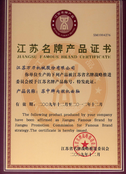 Jiangsu famous brand product certificate |