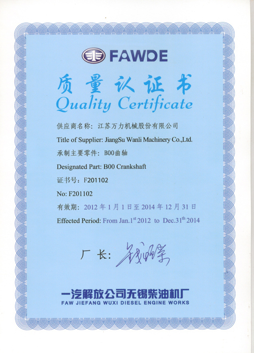 Quality certification from Faw Jiefang, Wuxi Diesel-engine Works |