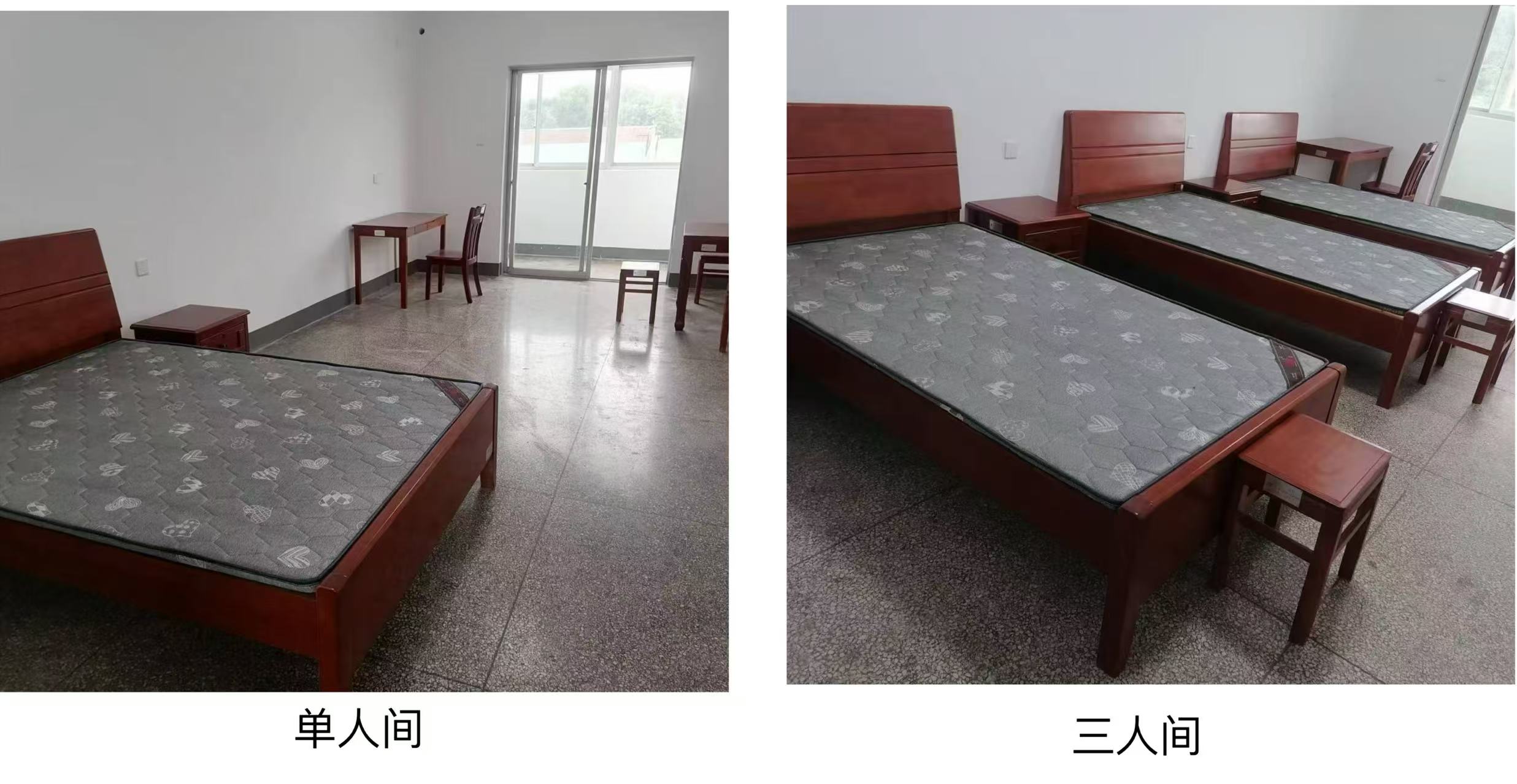 每個(gè)房間均按家居標(biāo)準(zhǔn)新配置實(shí)木家具:床、床頭柜、方凳、寫字臺(tái)、椅子,單人間還購置了家用方桌。